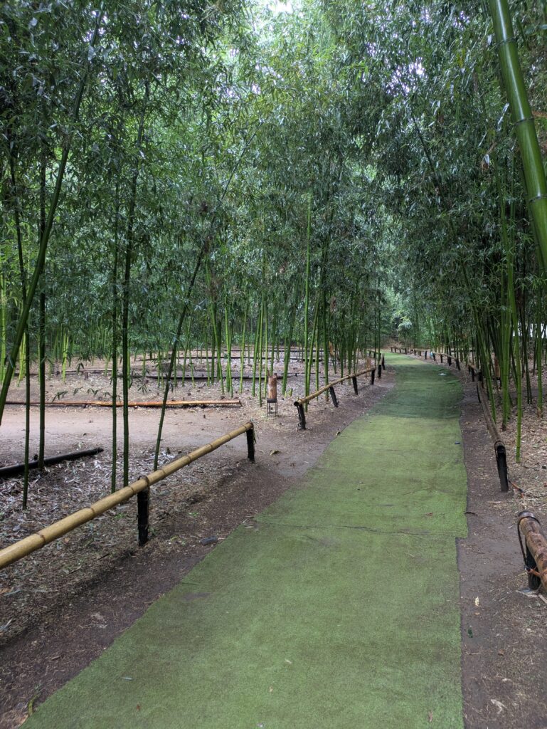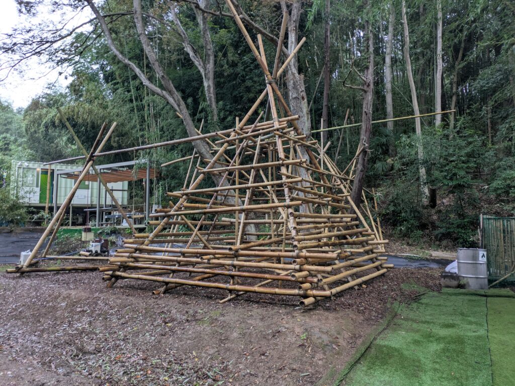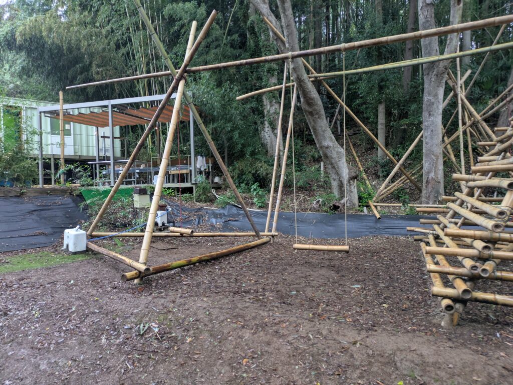 竹製ブランコとジャングルジム(?)の遊具もあります。