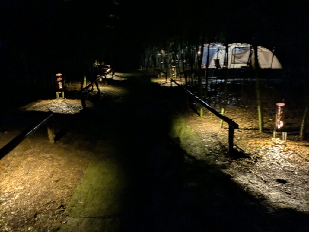 日が落ちるとサイト入り口に明かりが灯りいい雰囲気。