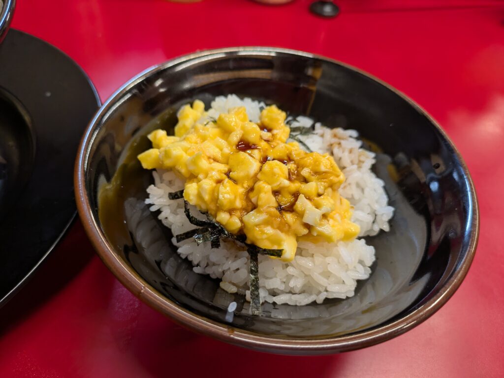 半玉子まぶしはご飯の上にのりと刻んだ半熟玉子に醤油ダレ。