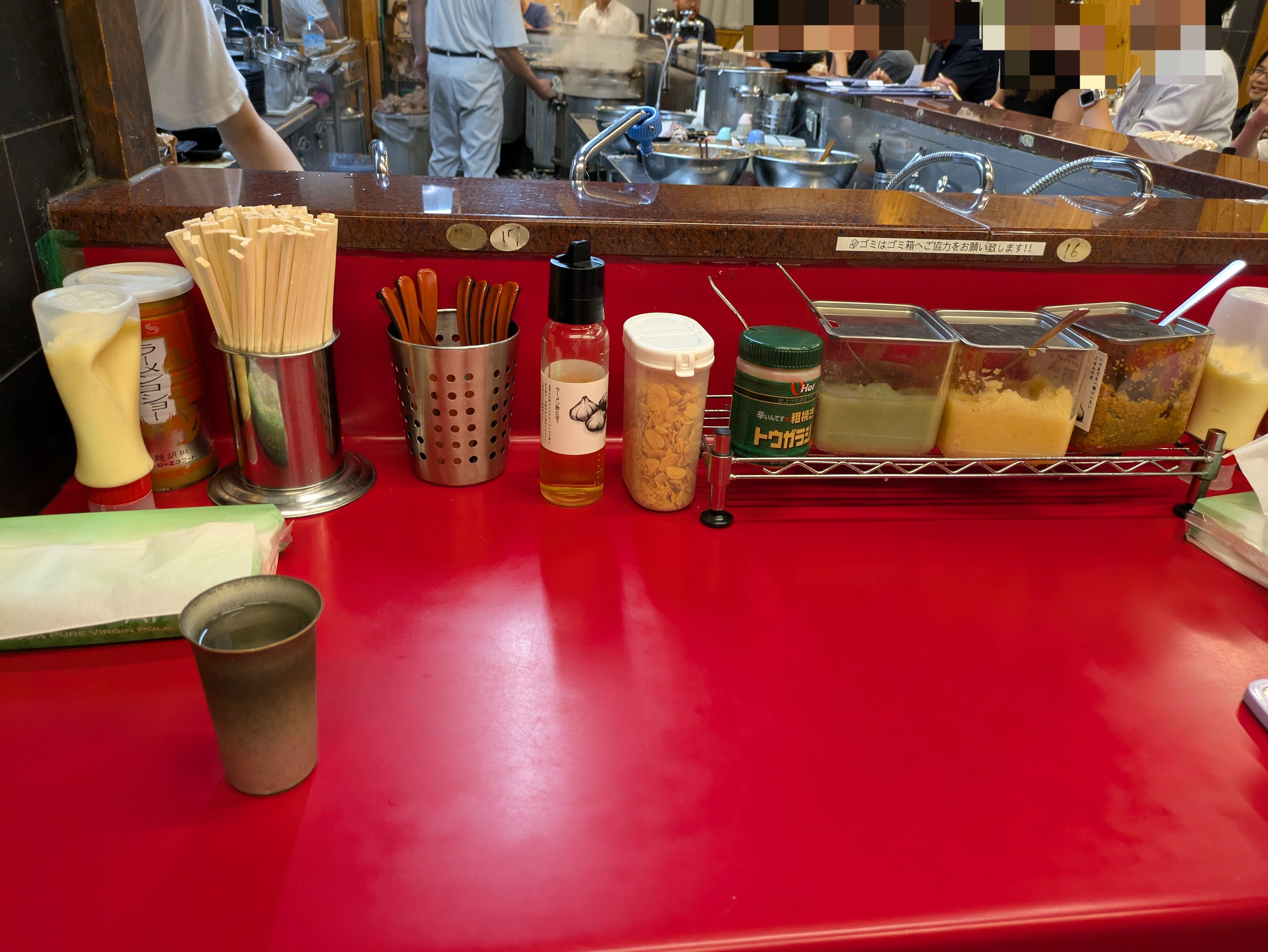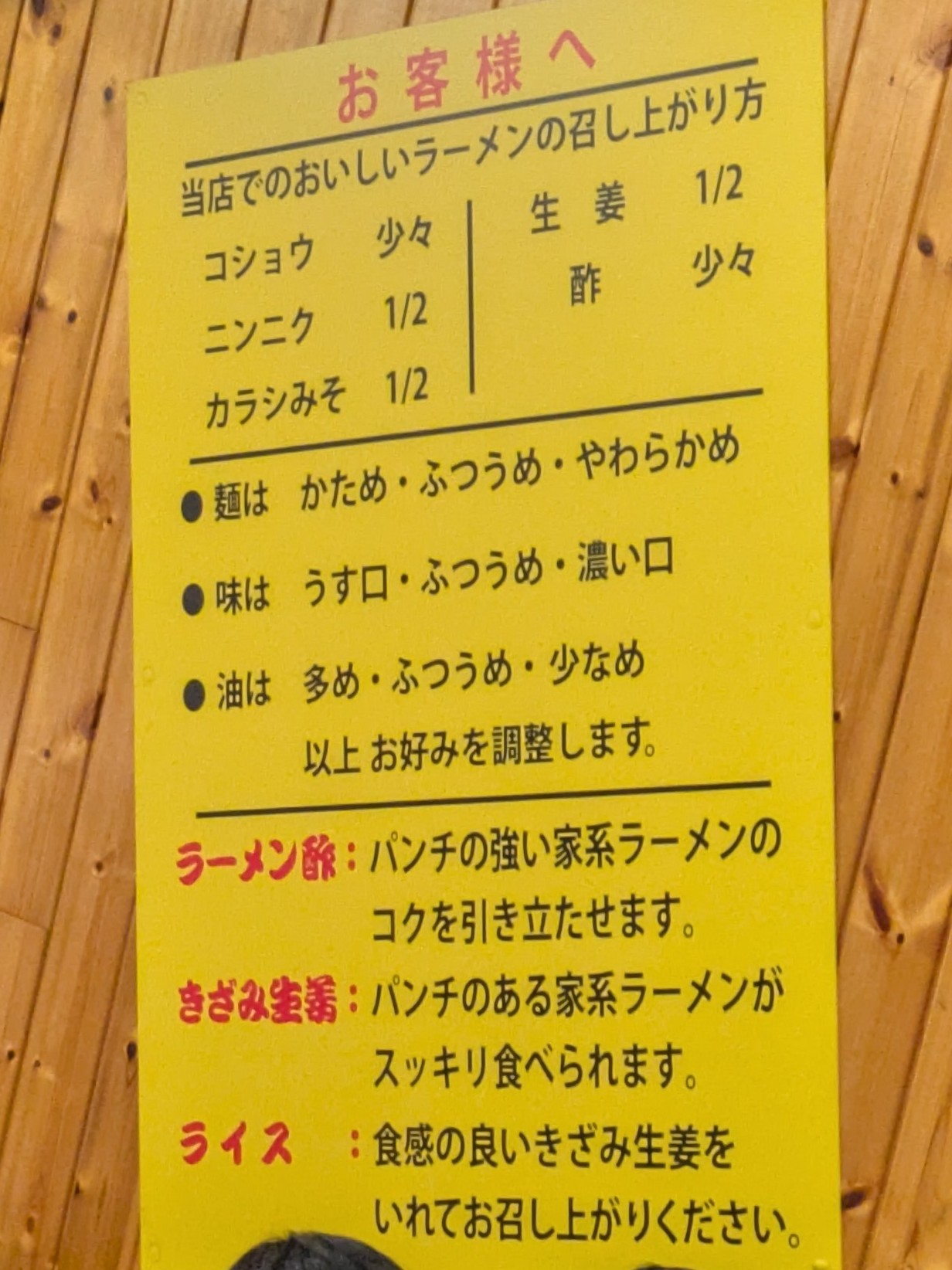 その後、店員さんが食券回収に来て、麺の硬さ、味の濃さ、油の量のお好みを聞かれます。